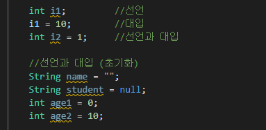 - 변수 선언과 동시에 값을 대입함 (변수 선언 및 초기화)