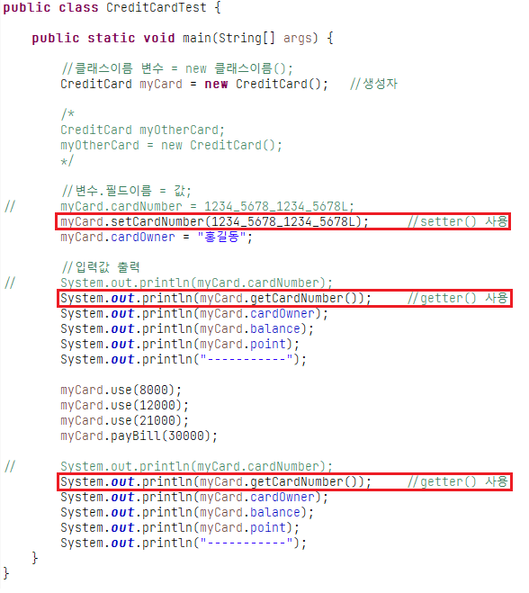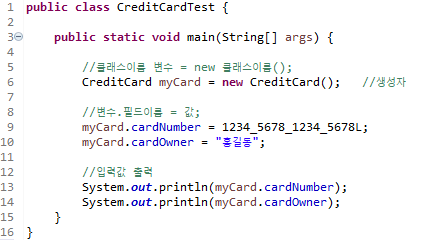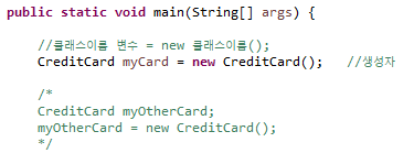 - 객체를 생성하기 휘해서는 키워드 new 이후에 CreditCard()와 같이 생성자를 호출