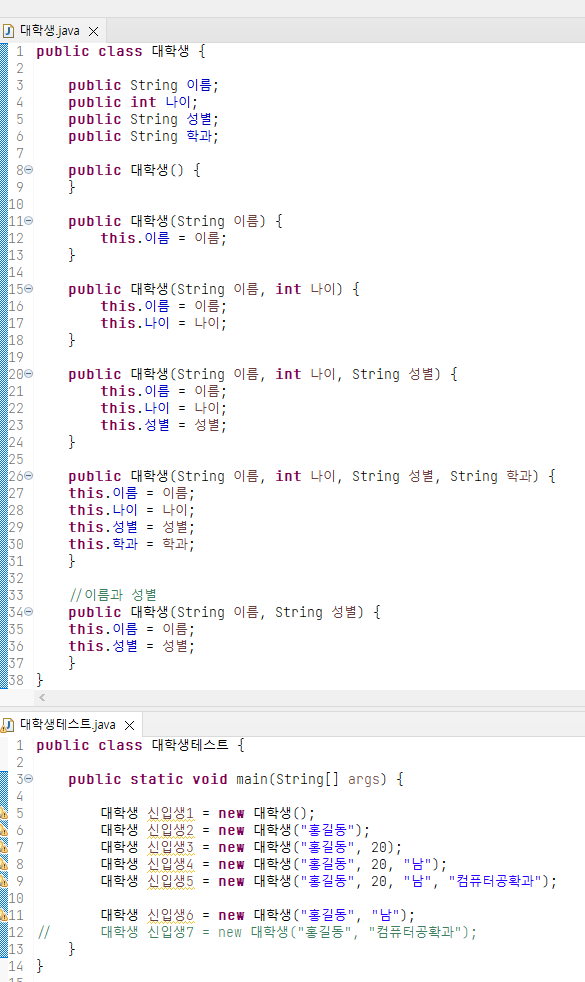 - 하나의 클래스에서 인자가 다르면 생성자를 여러 개 구현 가능