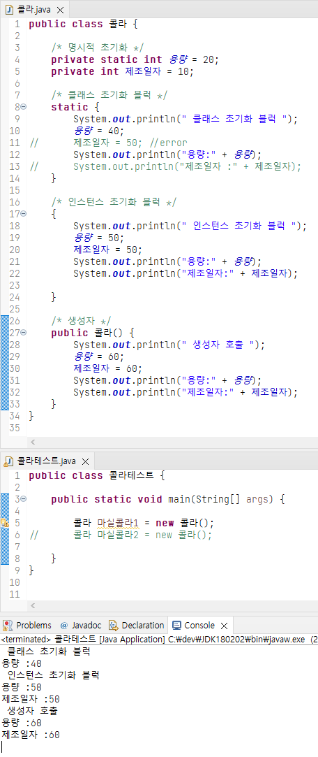 - 초기화 블럭 : 클래스 초기화 블럭, 인스턴스 초기화 블럭