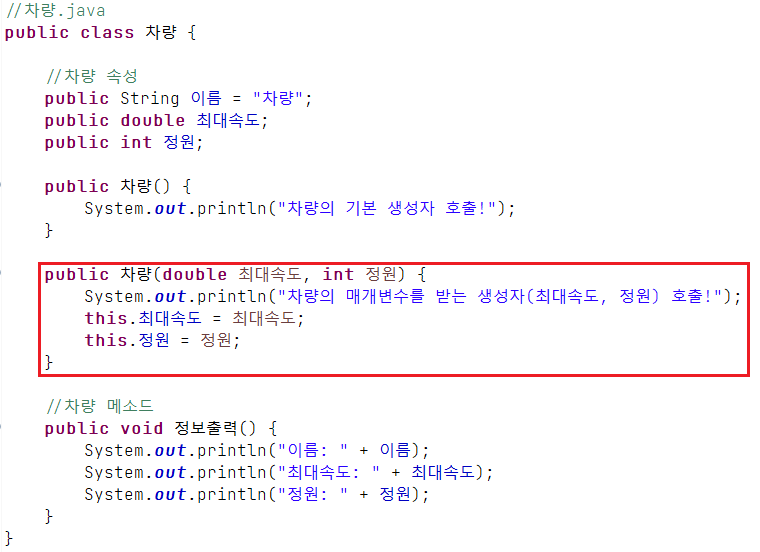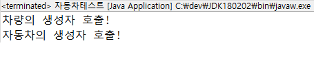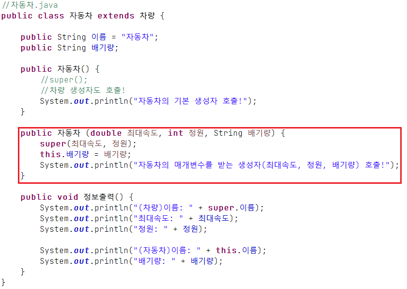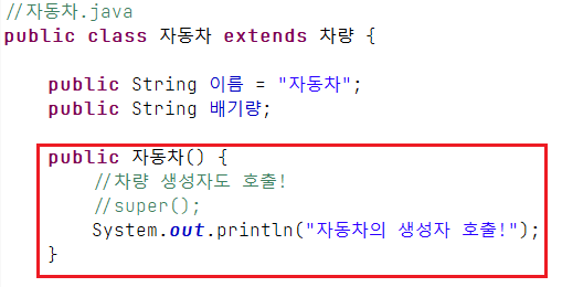 - 자동차의 생성자 호출되는 첫 줄에 super() 호출에 의해서