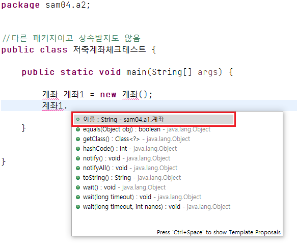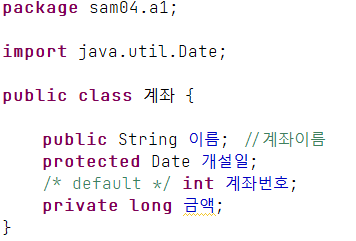 - public - 모두 접근 가능 (다른 패키지인 경우 import 필요)