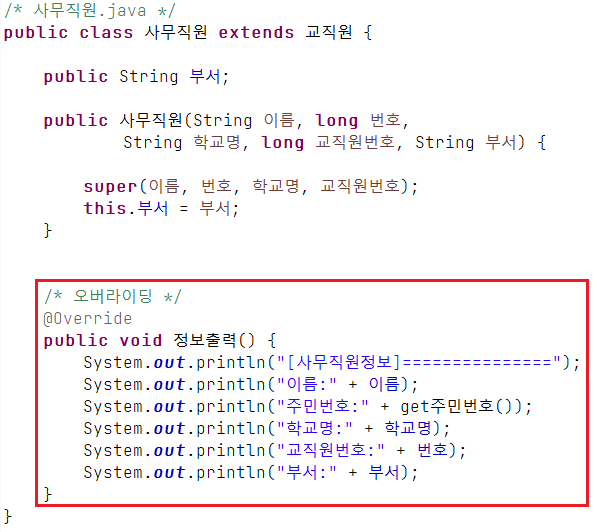 - 상위 클래스의 동일한 메소드를 하위 클래스에서 다시 정의(코드를 다시 구현)