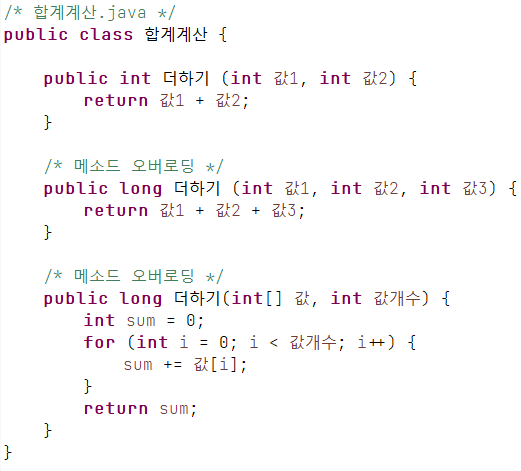 - 클래스 내부에서 인자가 다르나 이름이 같은 메소드가 여러 개 정의된 경우