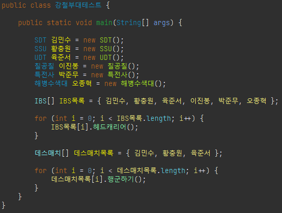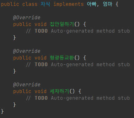 - 다중 상속인 경우 상위 인터페이스 여러 개를 쉼표로 구분하여 나열