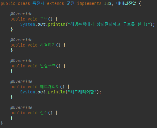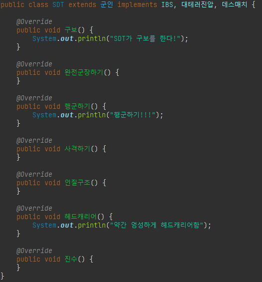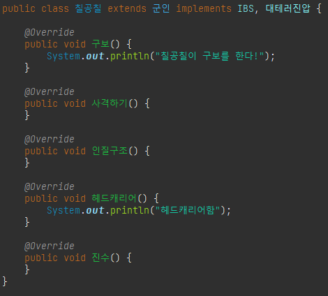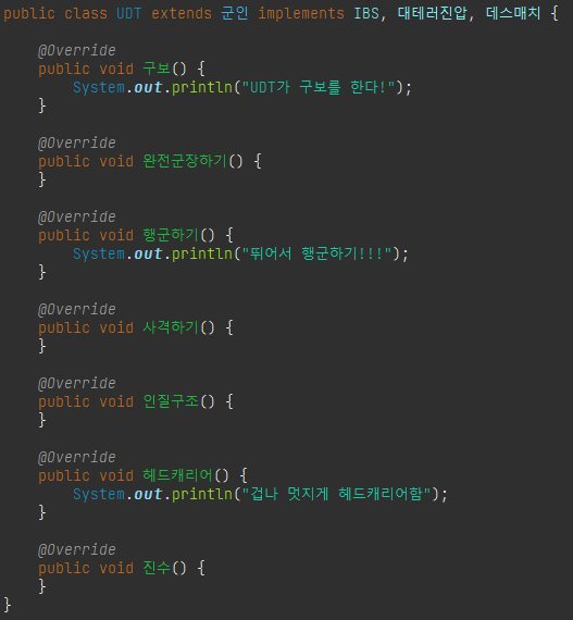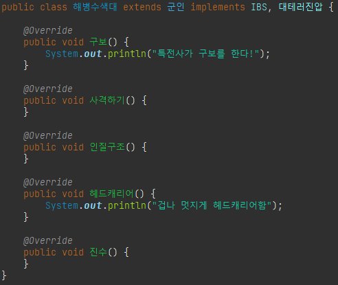 - 상위 인터페이스에서 정의한 모든 추상 메소드를 구현