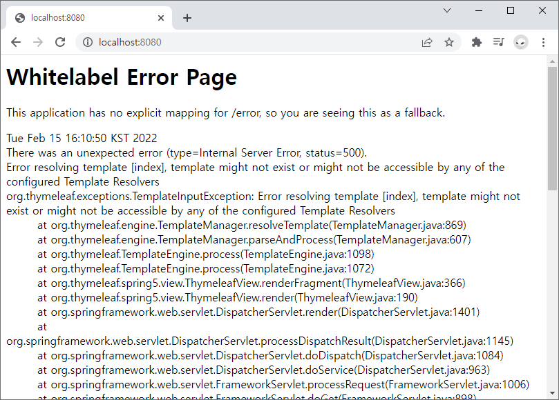 Thymeleaf를 통하여 'templates/index.html' 로 매핑되어서 페이지가 보임