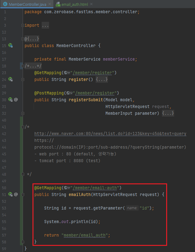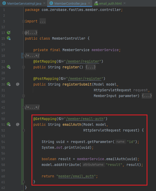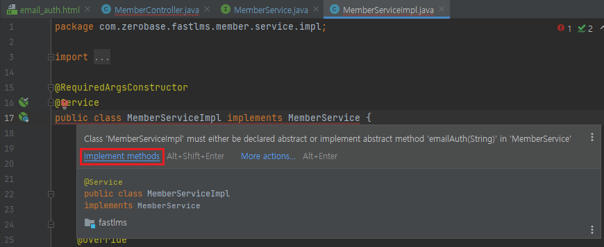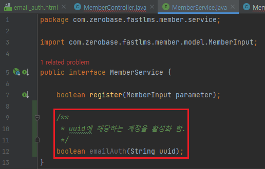 - 인터페이스(MemberService.java)에서 emailAuth가 추가