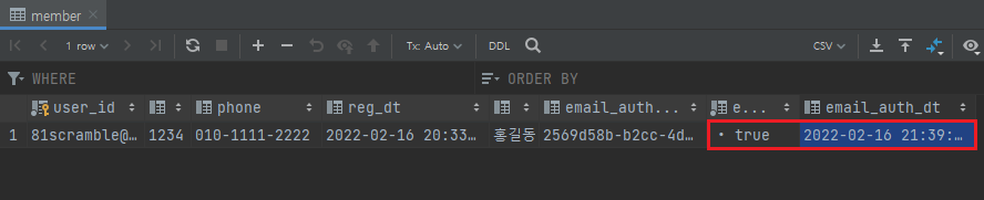 - 계정인증시간(email_auth_dt)가 입력된 것을 확인