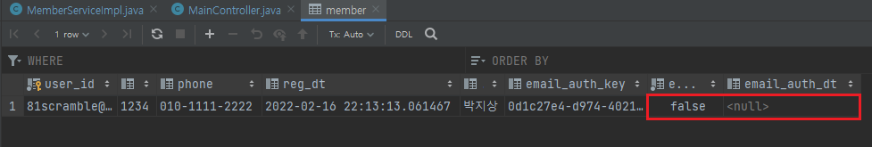 - 가입된 회원정보의 계정인증여부(email_auth_yn) 값 false 확인