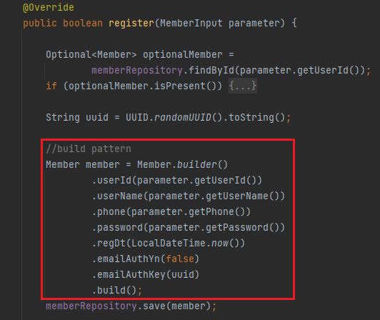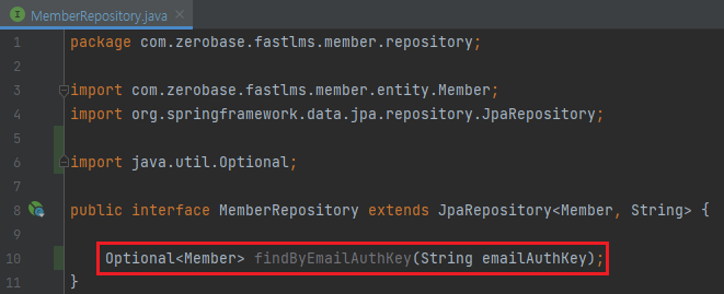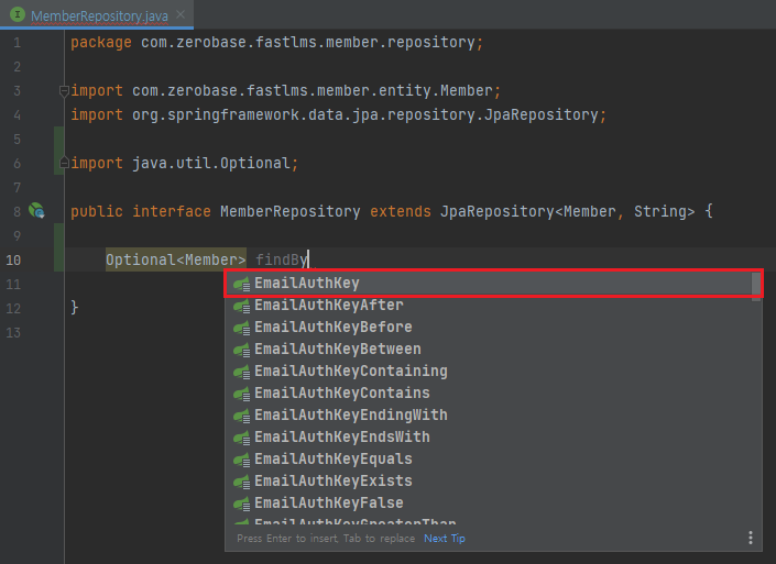 - Optional<Member> findByEmailAuthKey <Tab or Enter>