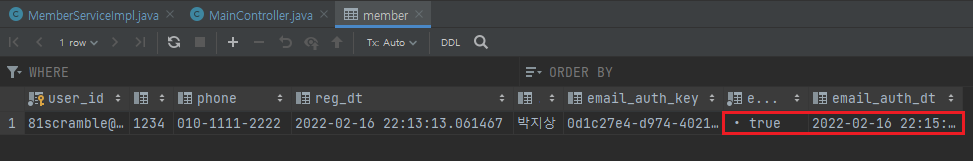 - DB에서 계정인증여부(email_auth_yn) 값 true로 설정되고