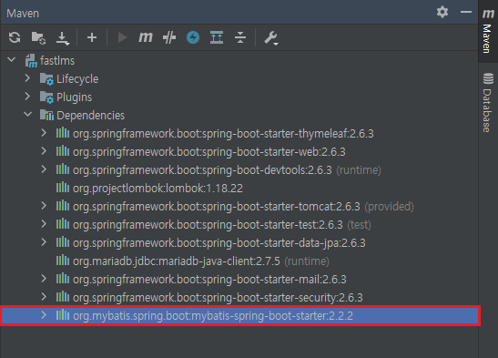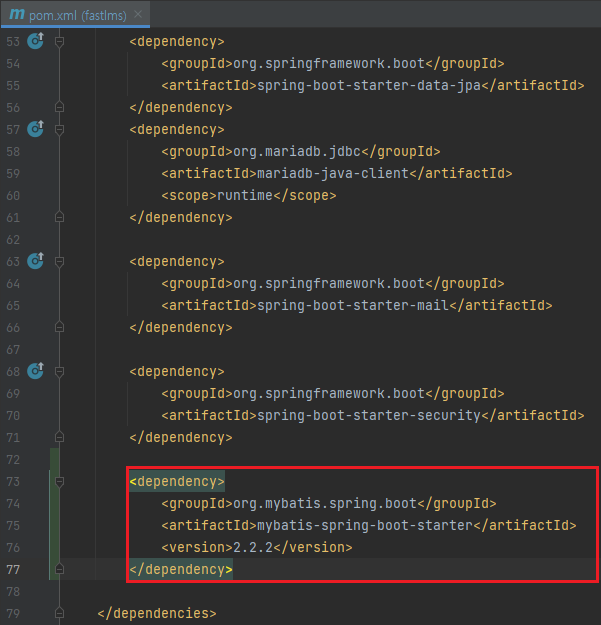 - fastlms프로젝트의 pom.xml 파일에 mybatis dependency 붙여넣기