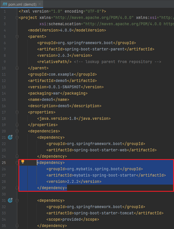 - 데모프로젝트의 pom.xml 파일에서 mybatis dependency 복사