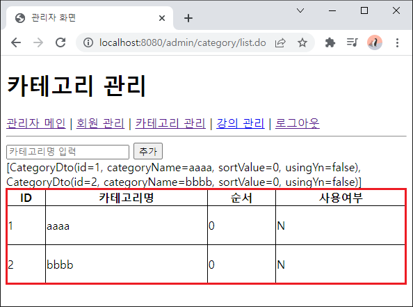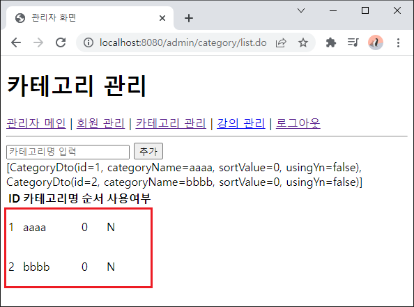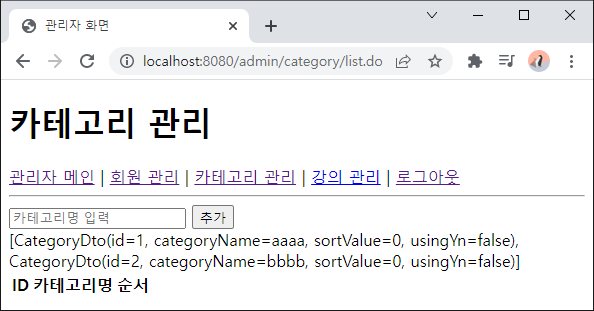 - 입력된 카테고리 정보 출력