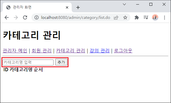 - 카테고리 관리 페이지로 접근한 모습