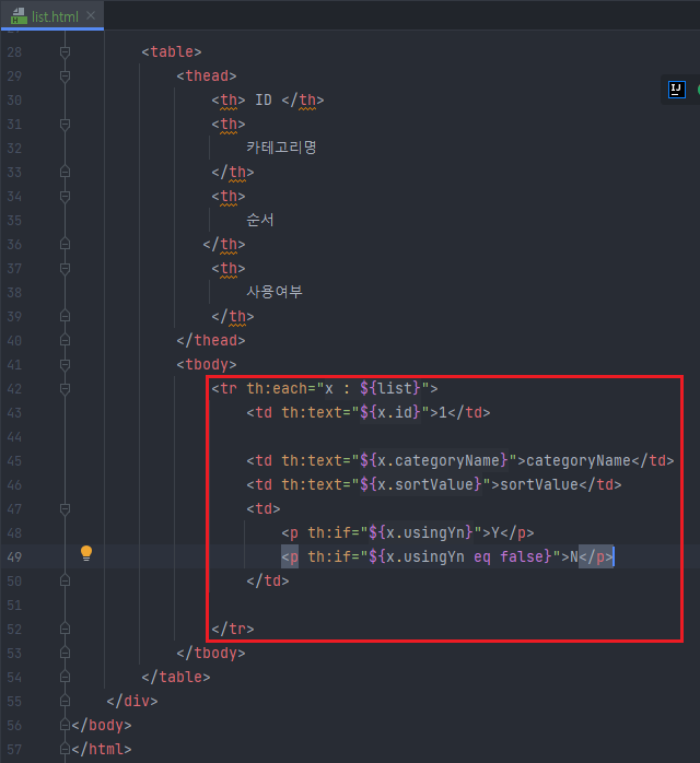 <p th:if="${x.usingYn eq false}">N</p>