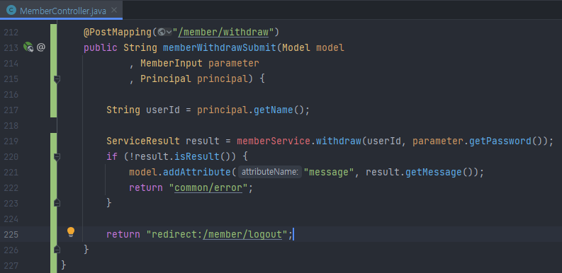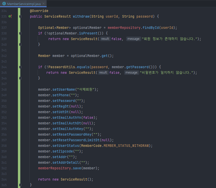 ServiceResult result = memberService.withdraw(userId, parameter.getPassword());