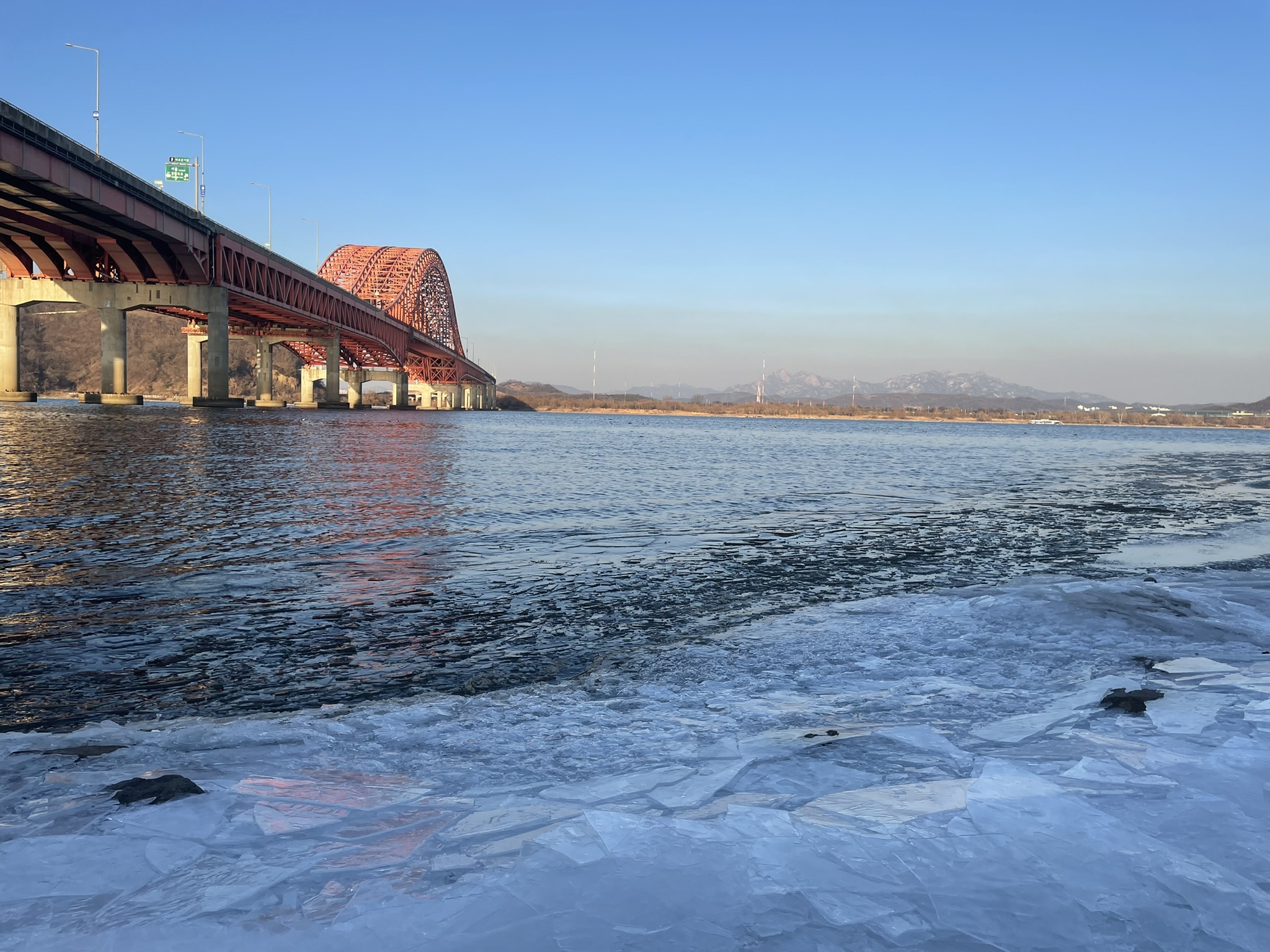 방화대교가 보이는 한강에 얼음조각들이 밀려왔다.